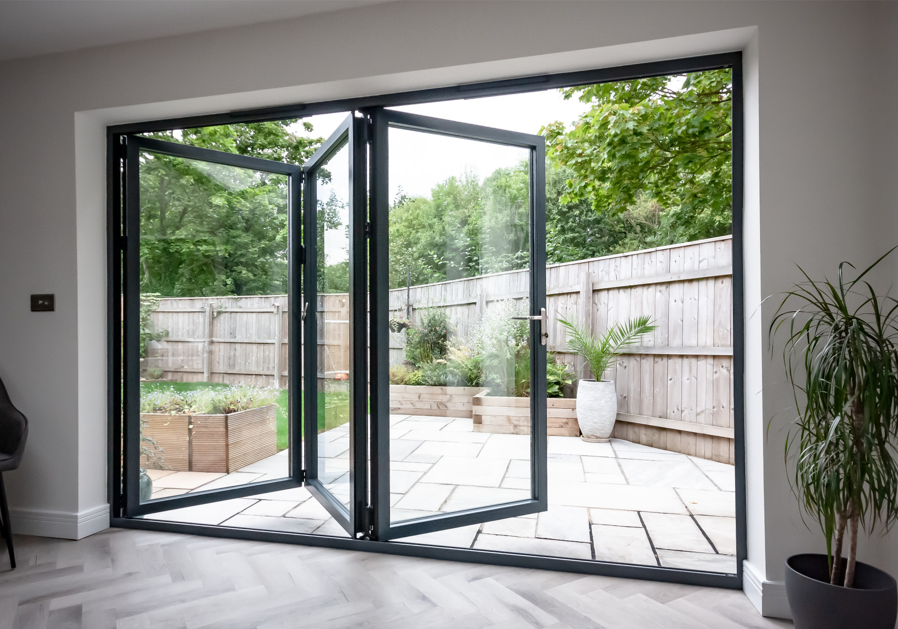 When it comes to bringing more of the outdoors into your home, it’s the details in your bi-folding doors that make the difference. Great looking handles in matching finishes. A perfect glide and ease of use with engineered hardware that will keep this way for years to come. Slim profiles in hard wearing powder coated finish adding style to your home. Superb thermal properties and PAS24 security features. Korniche bi-folding doors get every element right.